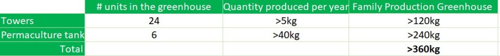 In concrete terms, with a 22m2 Myfood Family Production greenhouse equipped with 5 permaculture tanks (perma module) and twenty-four vertical aquaponics towers (with extension module) – Investment: €13,000 incl. VAT – here’s the expected productivity: